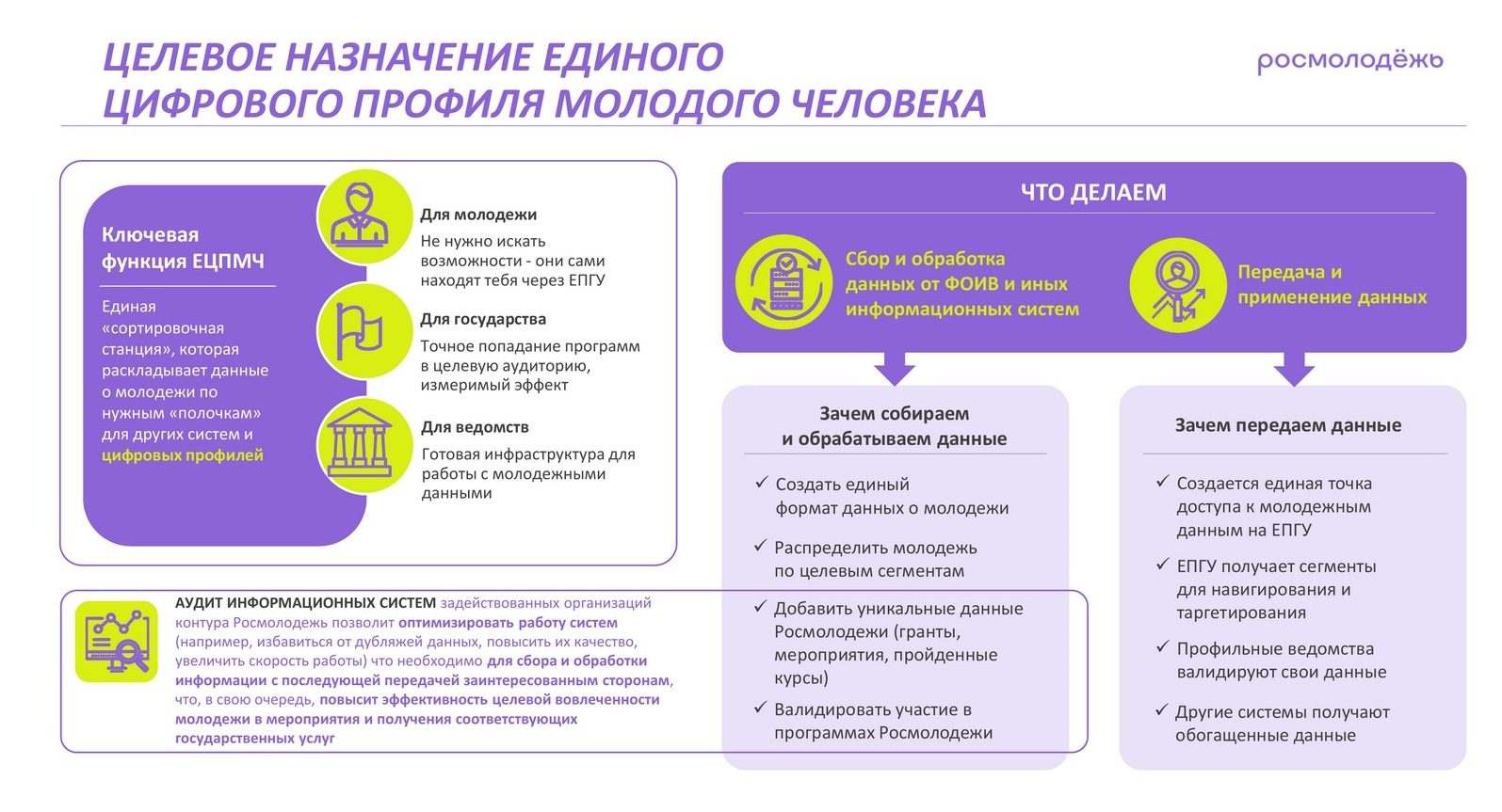 Целевое назначение ЦПМЧ тоже очень интересное – якобы он вводится «для молодежи, государства и ведомств» (бизнес тут стыдливо не упомянут). Они хотят «распределить молодежь по целевым сегментам», «валидировать участие в программах Росмолодежи», а передают они ПД подростков для того, чтобы «создать единую точку доступа к молодежным данным на ЕПГУ», получить новые «сегменты для таргетирования» (т.е. рассовывания подростков по заданным категориям). И загадочно добавлено, что «другие системы получают обогащенные данные». Какие именно обогащенные данные, какие именно системы и для чего их получают – история умалчивает. А ведь это сведения о личностях нового поколения россиян. И зачем вообще создавать «единую точку доступа» к ним? Видимо, для того, чтобы «кто следует» ими воспользовался. Про кибербезопасность тут просто молчим.