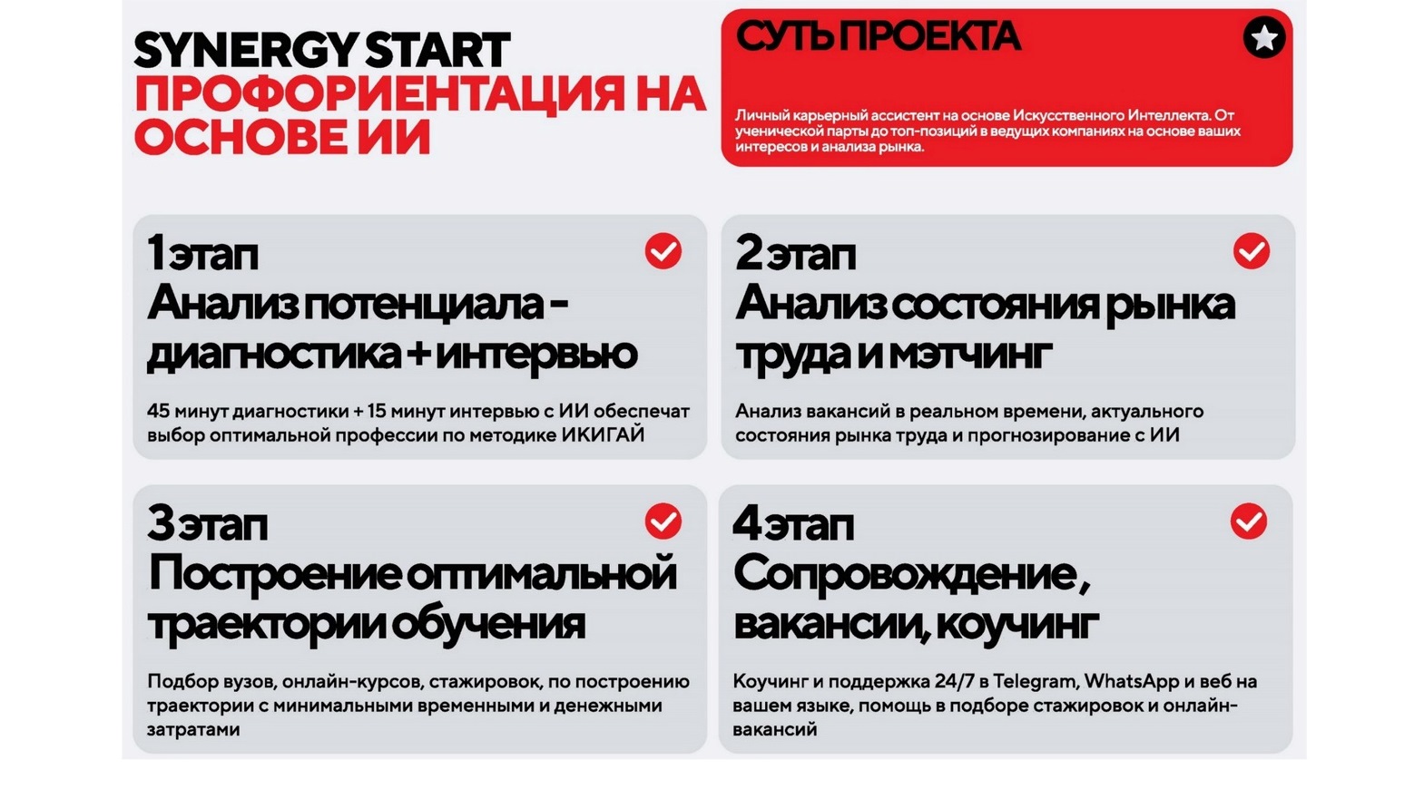 В рамках проекта ЦП нейросеть будет строить для молодого человека персональную карьерную траекторию (на основании собираемого с него 24/7 цифрового следа), давать прямые рекомендации по выбору профессии/строительству карьеры. Это называется «личным карьерным ассистентом от ученической парты до топ-позиций в ведущих компаниях».