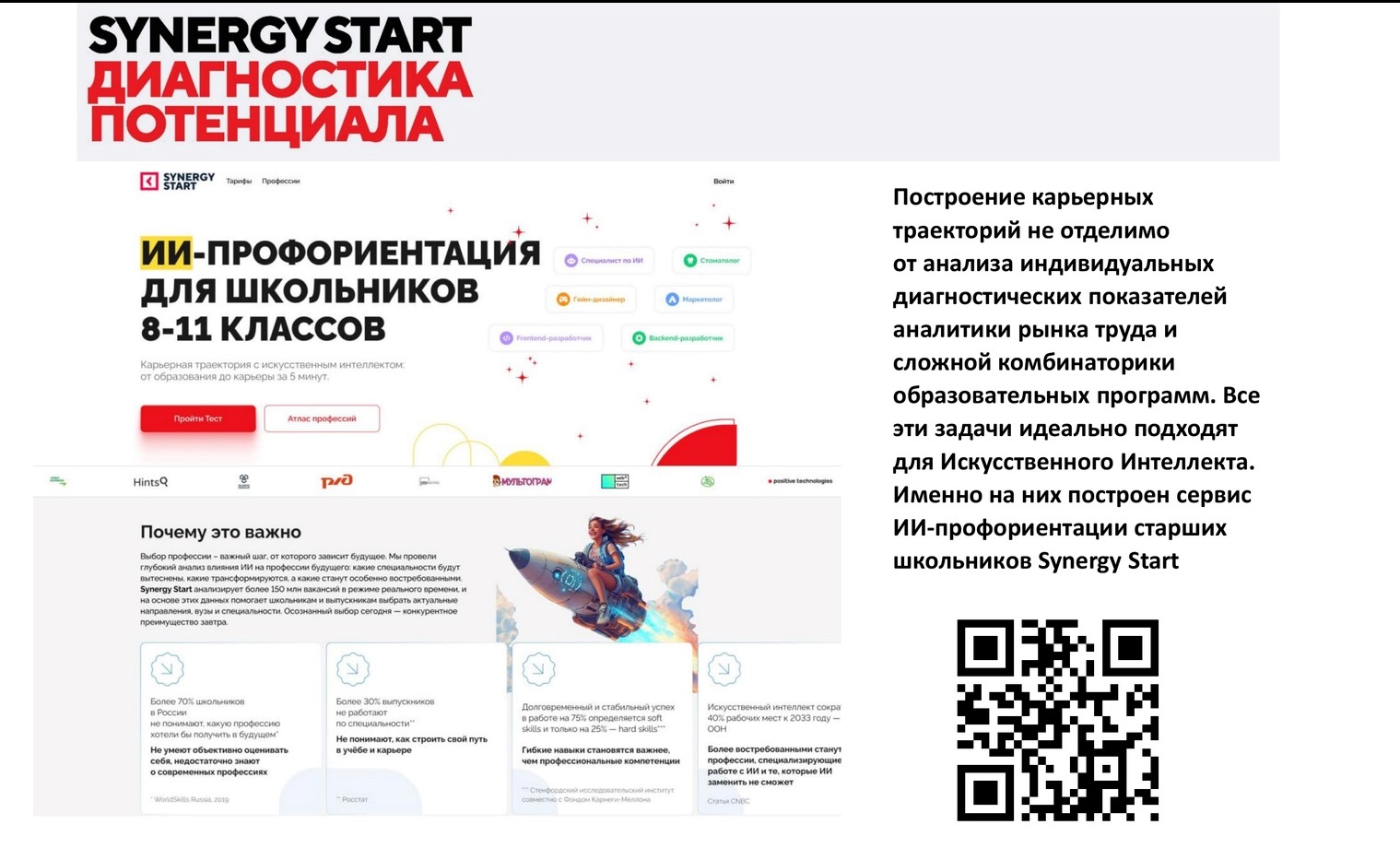 Какая экономия времени реальных представителей профессии – и профориентацией «на местах» можно не заниматься. Нейросеть сама введет в курс дела и поделится впечатлениями от будущей работы. То есть человеческий фактор, по мнению автора презентации, в профориентации можно просто обнулить. А работать, интересно, подросток/студент тоже будет виртуально? Или за него это будет делать «цифровой аватар»? Похоже, что так.